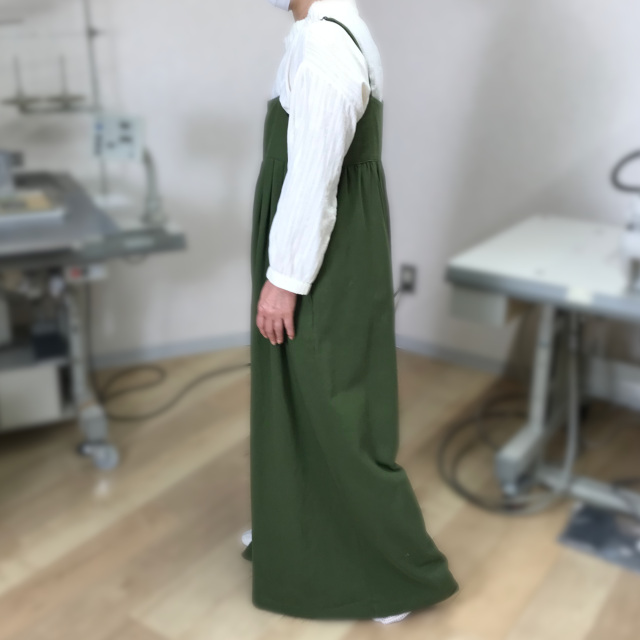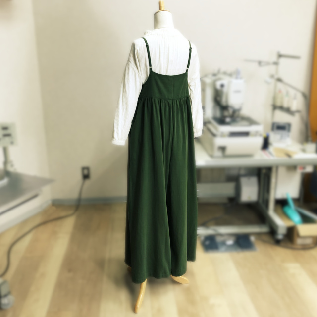胸当て(丈):12.5、背当て(丈):12.5、裾幅:51、胸当てから裾:115、肩紐最長丈:45、股下:66